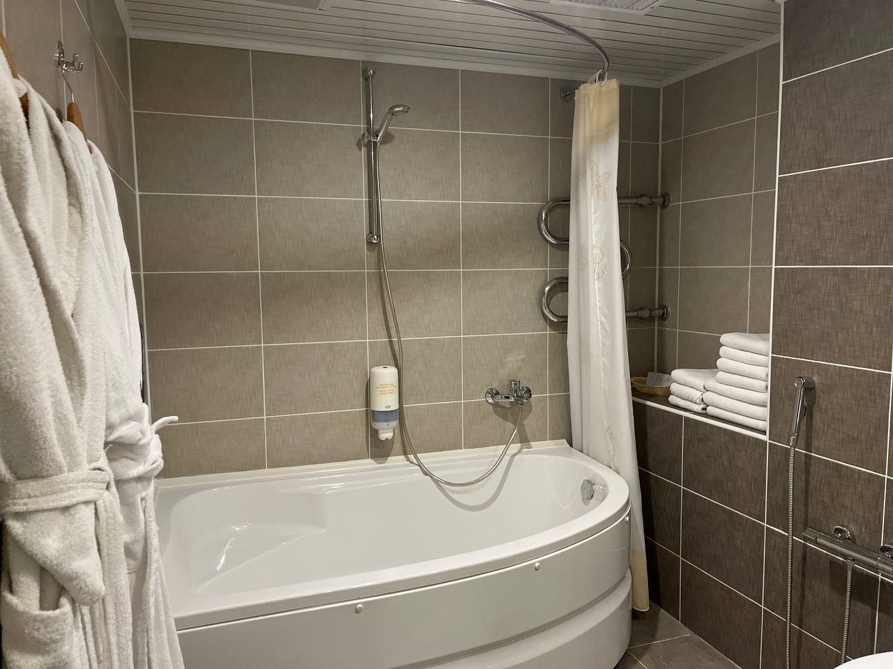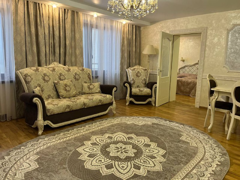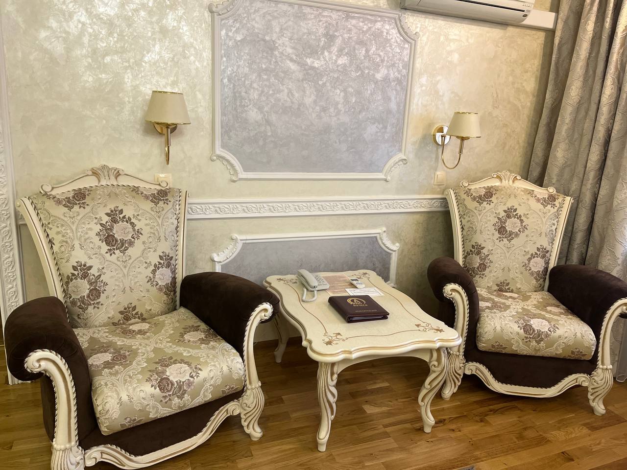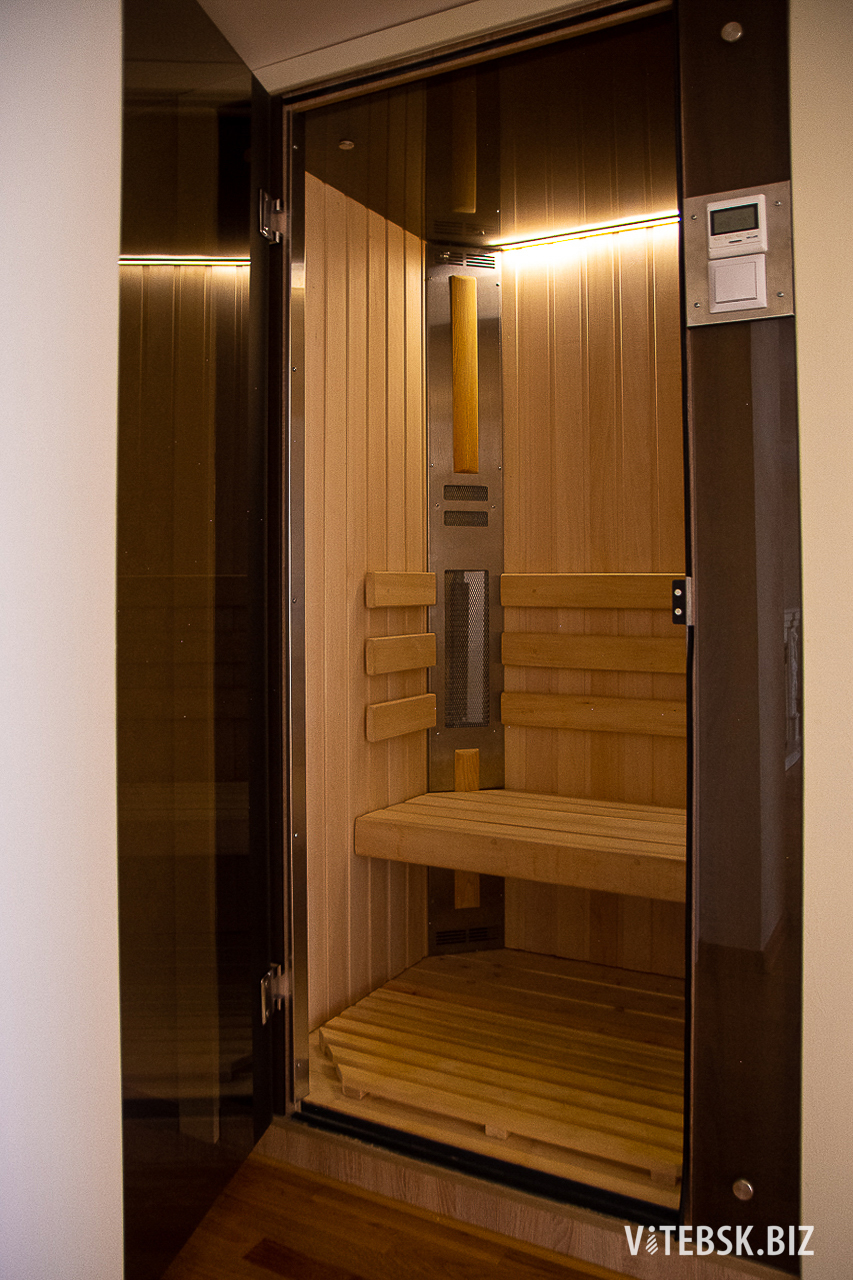 Эксклюзивные трехкомнатные апартаменты. Уникальный интерьер номера подчеркивает особый статус гостя и создает тон для красивого отдыха. К красоте и роскоши располагает все: декорированная гостиная с обеденным столом и уютной зоной для отдыха, элегантная спальня, рабочий кабинет, собственная мини-кухня со всей необходимой бытовой техникой и набором посуды, просторная ванная с набором косметических средств и банными принадлежностями. Декоративный камин создает реалистичный эффект живого пламени. Отдельным достоинством номера является инфракрасная сауна, где в любое время можно насладиться оздоровительными процедурами. Кабинет номера оснащен диваном-кроватью, которую можно использовать в качестве дополнительного спального места (за дополнительную плату). Кондиционер работает в гостиной. Площадь номера:77 кв.м. В комплектацию номера дополнительно входит питьевая вода, одноразовые тапочки и халаты. Зубная паста и щетка, бритвенный набор и прочее - по запросу (за дополнительную оплату).