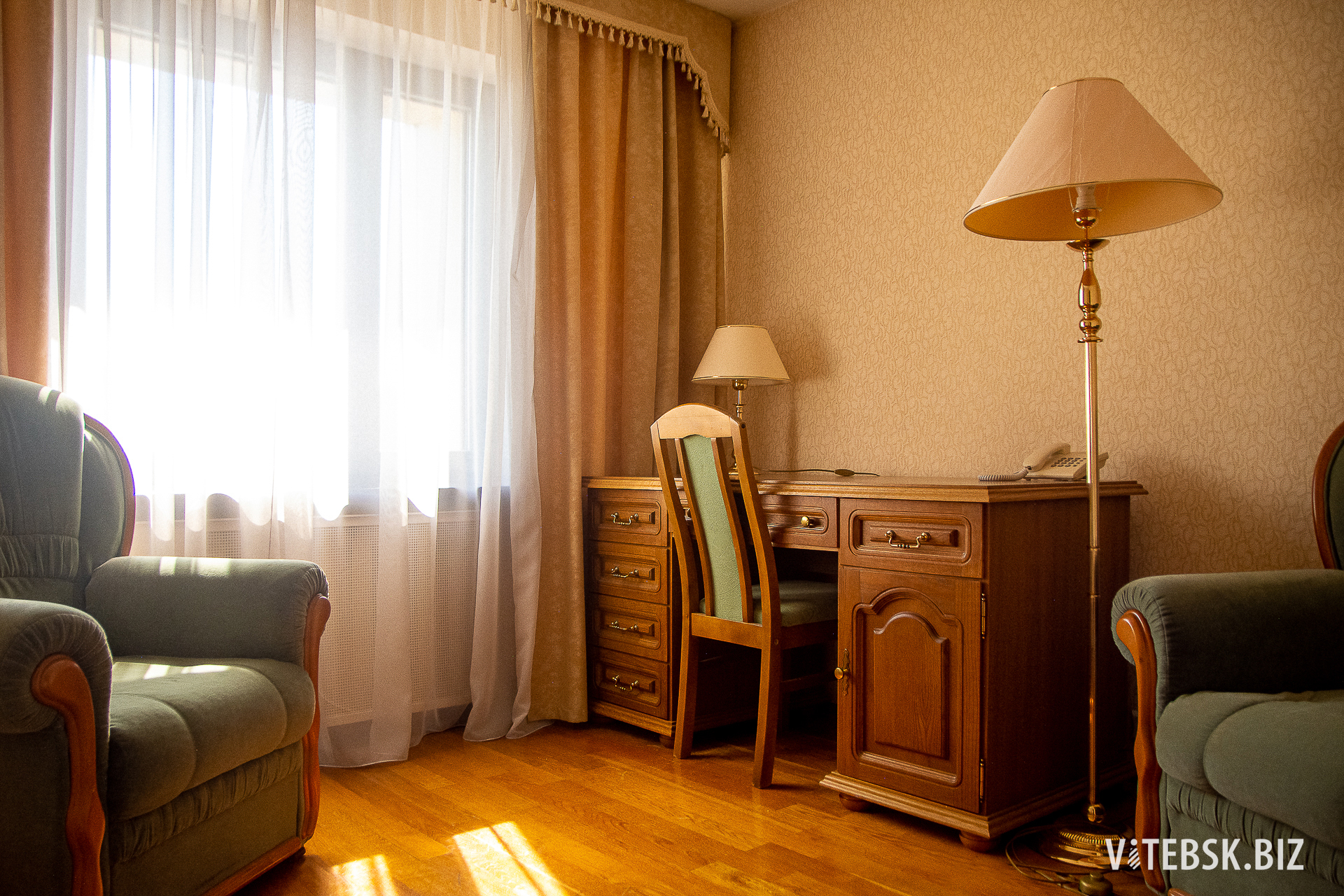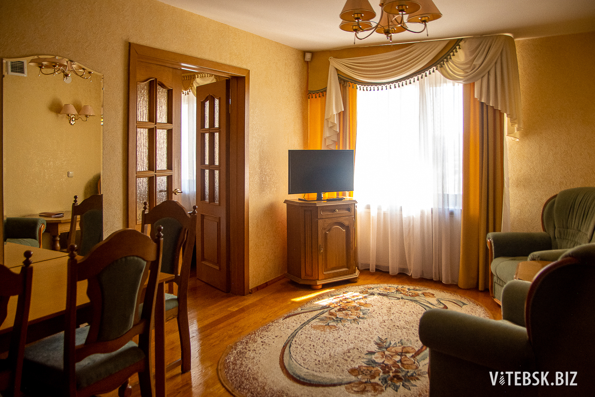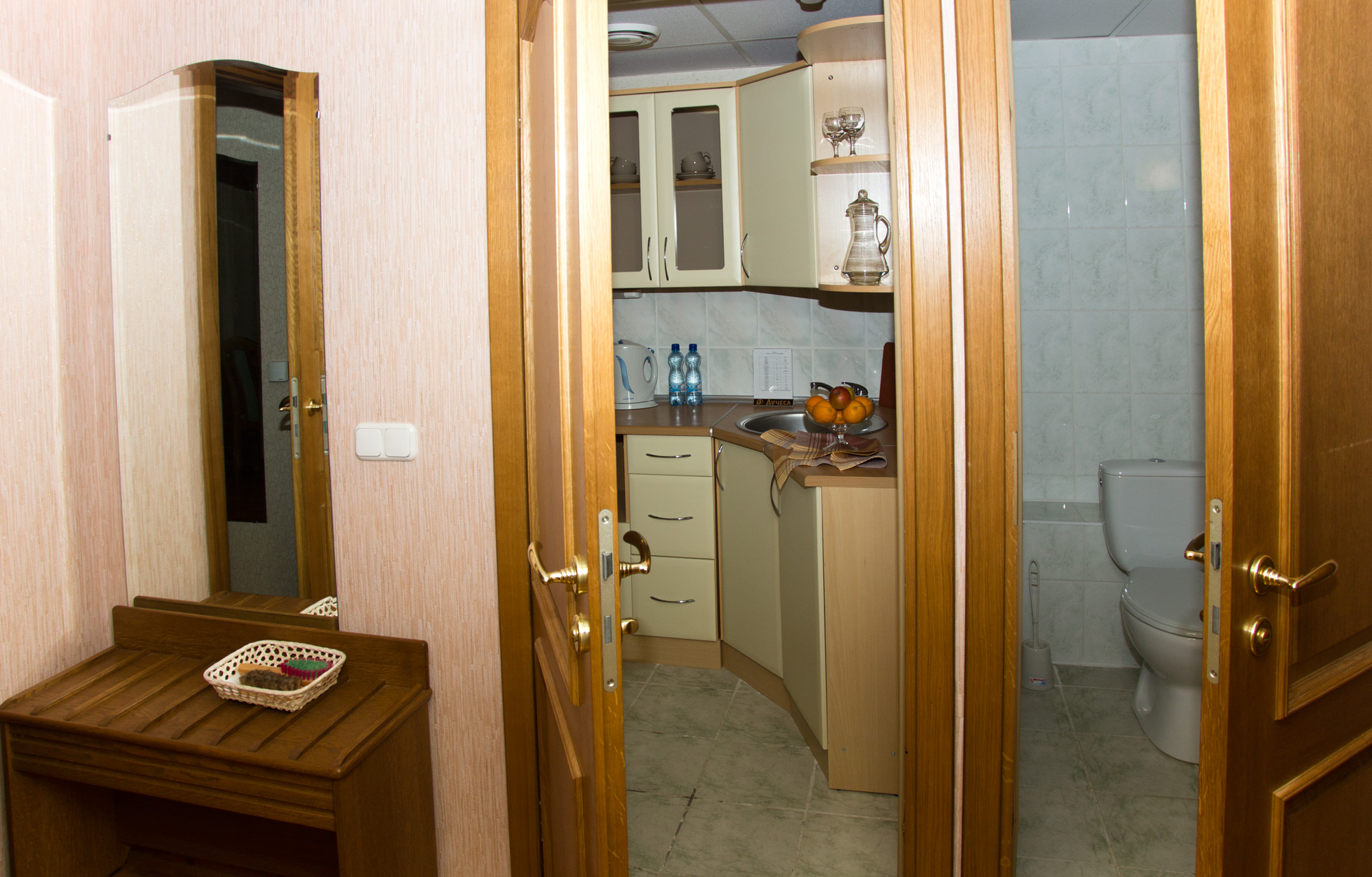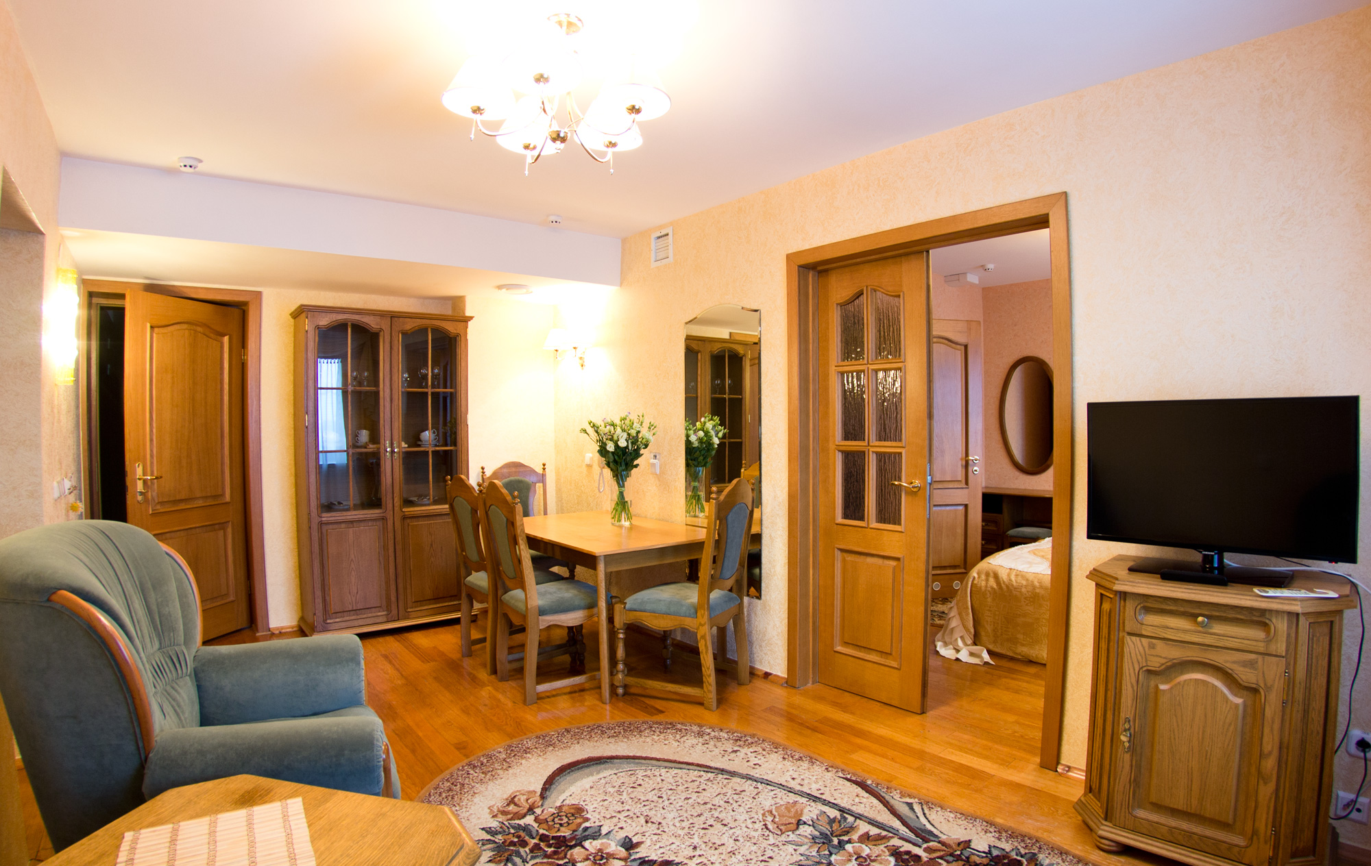 Трехкомнатный номер с одной кроватью, оснащенный всеми необходимыми удобствами для комфортного проживания. В гостиной - удобная, мягкая мебель с обеденным столом и зоной для отдыха. Кабинет для работы и мини-кухня с бытовой техникой. Номер предназначен для двухместного размещения.