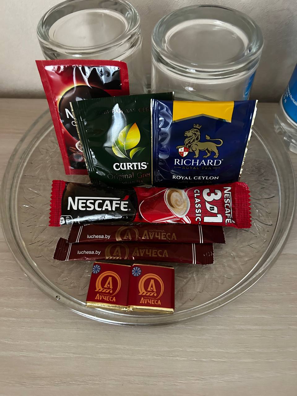 В комплектацию номера дополнительно входит набор посуды, питьевая вода, одноразовые тапочки, халаты.