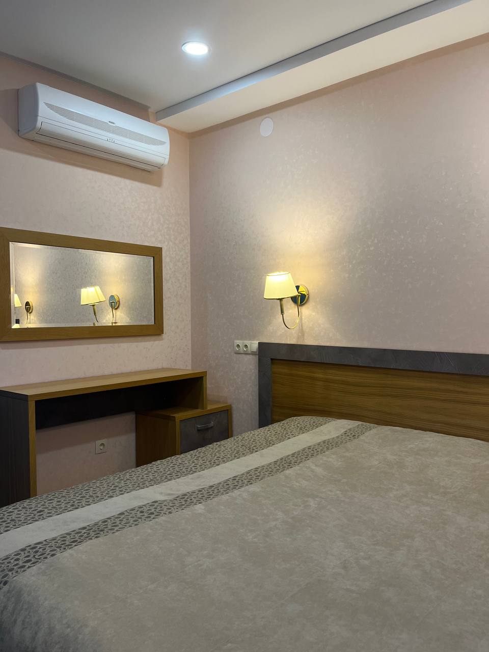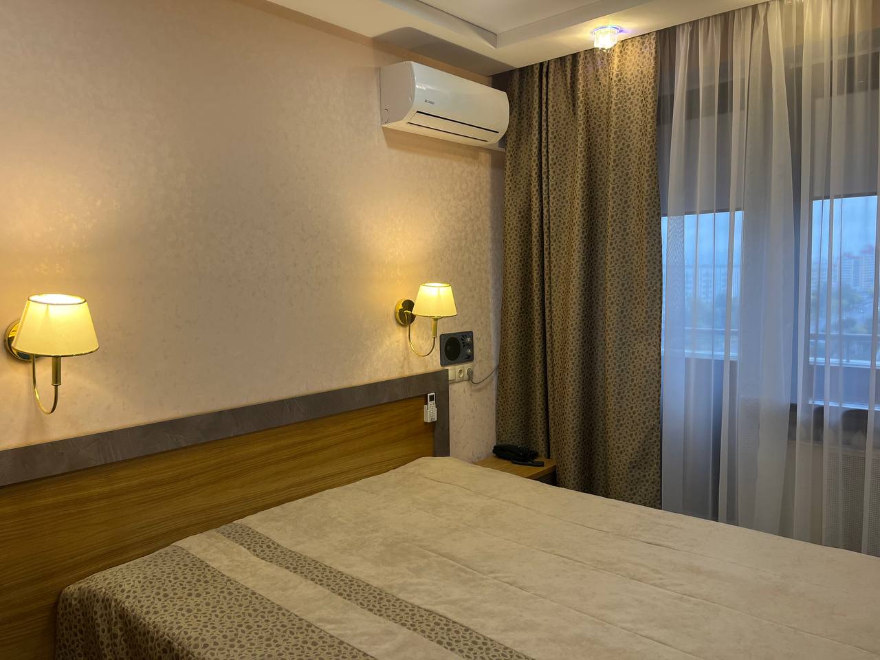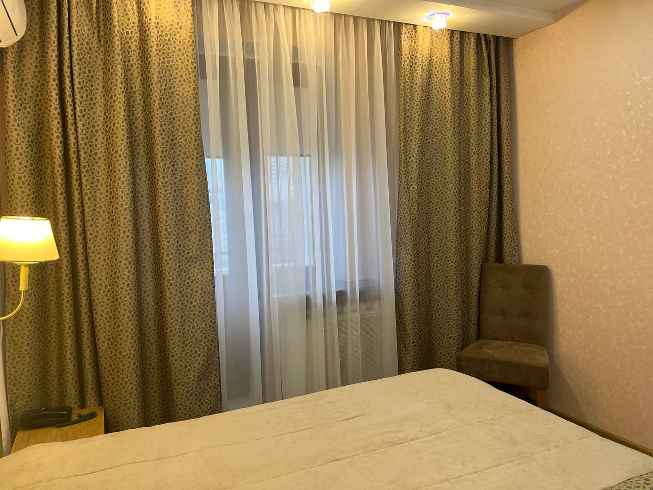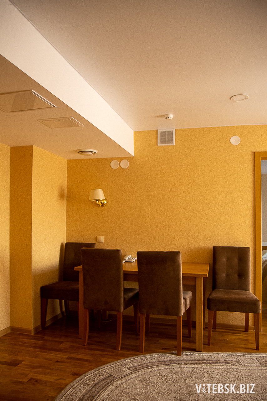 Просторный трехкомнатный номер, оформленный в современном стиле – идеальный вариант как для работы, так и для отдыха. Апартаменты включают спальню, уютную гостиную, кабинет для работы, мини-кухню с необходимой бытовой техникой, ванную с банными принадлежностями и набором косметических средств. Номер оснащен дополнительным гостевым санузлом. В рабочем кабинете установлен диван-кровать, который можно использовать в качестве дополнительного места (за дополнительную оплату). Кондиционер работает в спальне. Площадь номера: 50кв.м. В комплектацию номера дополнительно входит набор посуды, питьевая вода, одноразовые тапочки, халаты. Зубная паста и щетка, бритвенный набор и прочее - по запросу (за дополнительную оплату).